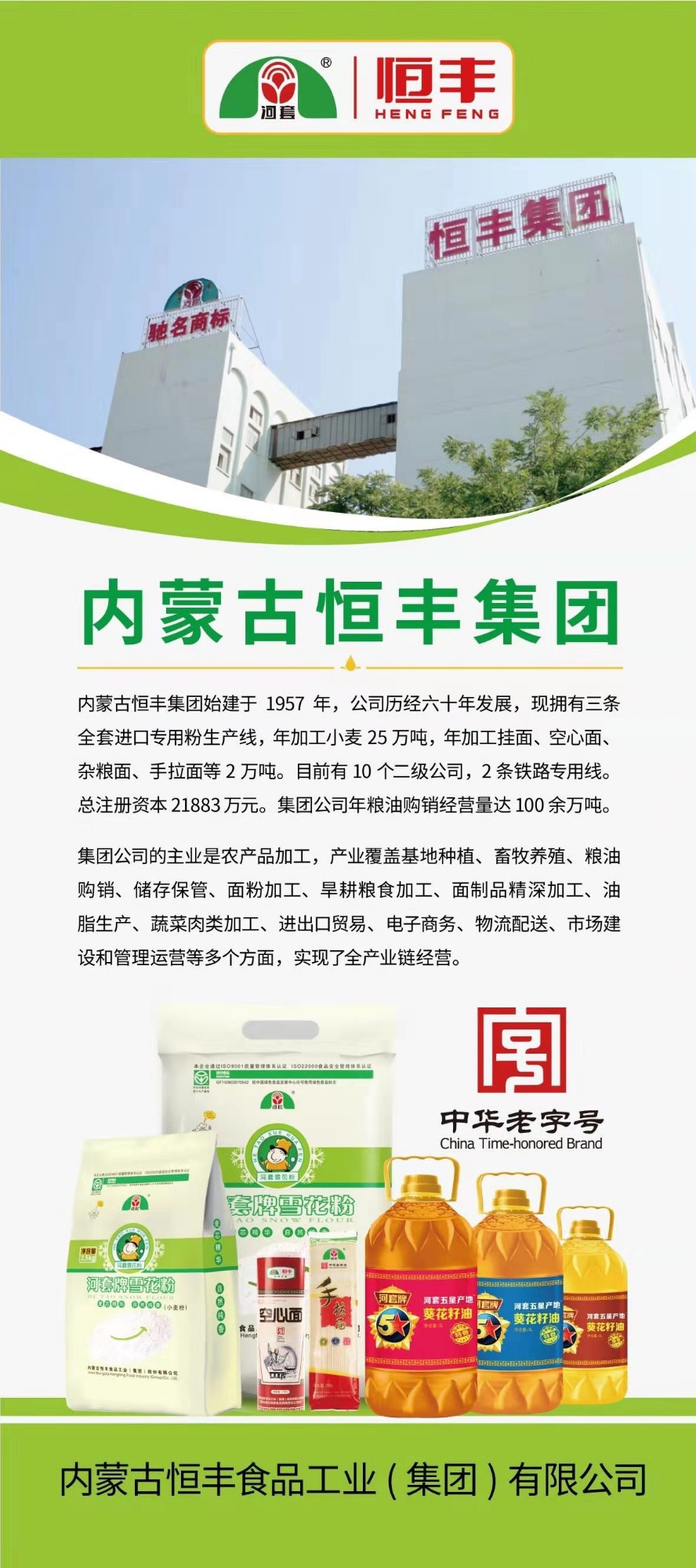 內(nèi)蒙古恒豐集團(tuán)始建于1957年,公司歷經(jīng)六十年發(fā)展,現(xiàn)擁有三條全套進(jìn)口專用粉加工設(shè)備,日處理小麥850噸。在河套地區(qū)擁有23個糧庫,糧食收儲能力65萬噸。集團(tuán)公司年加工小麥能力25萬噸。生產(chǎn)掛面、空心面、雜糧面、手拉面等2萬噸。總注冊資本24883萬元。集團(tuán)公司年購銷糧油經(jīng)營量達(dá)100余萬噸。
