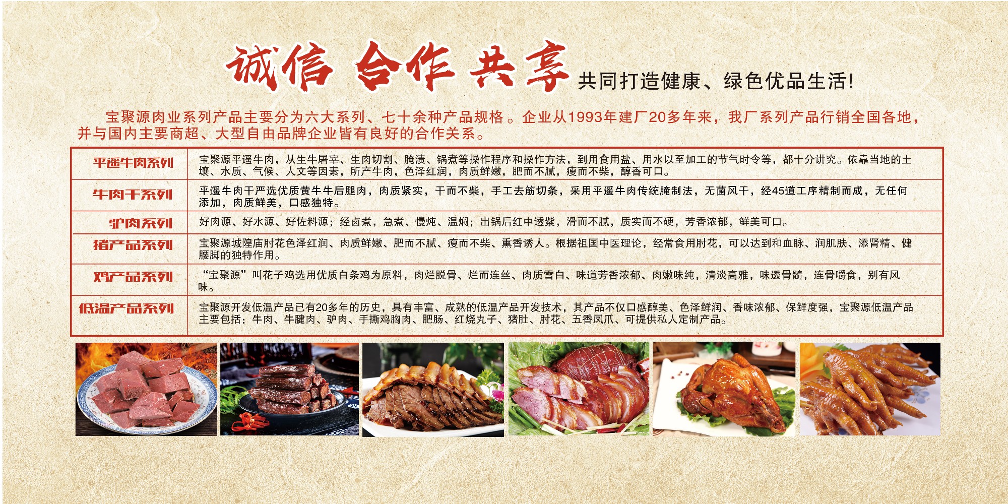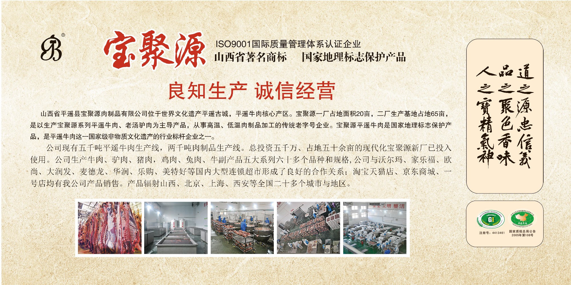 山西省平遙縣寶聚源肉制品股份有限公司位于世界文化遺產(chǎn)平遙古城岳壁鄉(xiāng)金莊村平南路11號(hào),公司秉承濃厚的晉商文化這一寶貴財(cái)富,發(fā)揚(yáng)平遙人敦厚智慧的創(chuàng)業(yè)精神,運(yùn)用傳統(tǒng)工藝和現(xiàn)代科學(xué)技術(shù)。主要以生產(chǎn)“寶聚源”牌平遙牛肉、驢肉、豬產(chǎn)品、雞產(chǎn)品等。